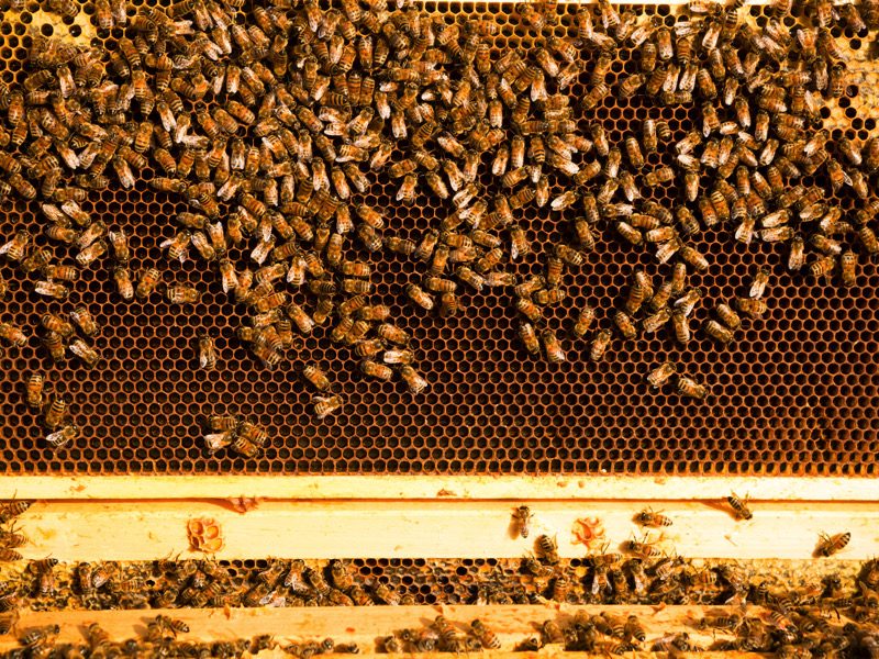 Close up of bees in a honeycomb in organic beekeeping in Naramata, British Columbia, Canada. Naramata is located in the Okanagan Valley.